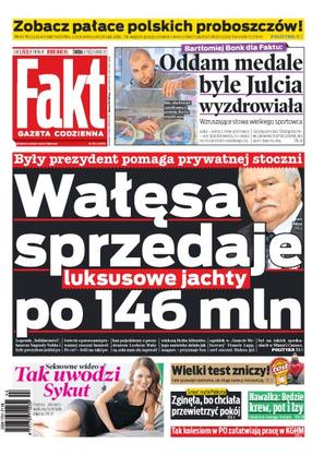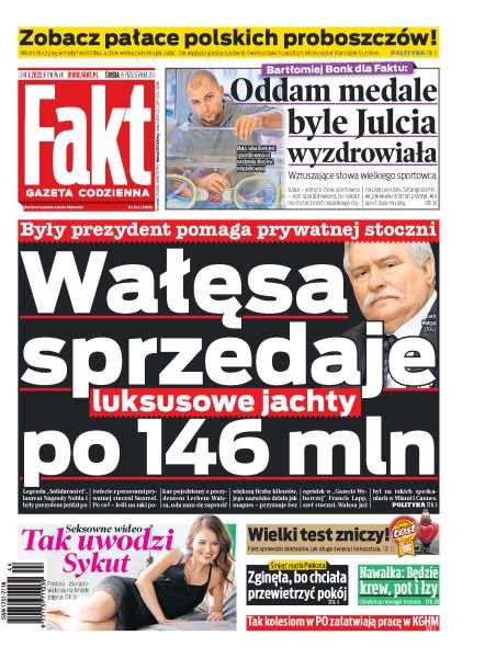Lech Wałęsa pomaga prywatnej stoczni sprzedawać luksusowe jachty; w jaki sposób zginęła matka Janusza Palikota; rozmowa ze sztangistą Bartłomiejem Bonkiem; test zniczy; 16-letnia Klaudia z Wodzisławia Śląskiego to już trzecia pacjentka wybudzona w klinice Budzik.