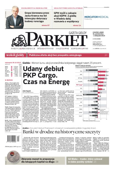 Akcje PKP Cargo zadebiutowały na giełdzie o 17,9 procent więcej niż wynosiła cena sprzedaży w ofercie; ceny akcji instytucji finansowych notowanych na warszawskiej giełdzie mogą dalej drożeć; PKN Orlen podpisał list intencyjny dotyczący ewentualnej budowy rurociągu dla produktów z Możejek do terminalu nad Morzem Bałtyckim.