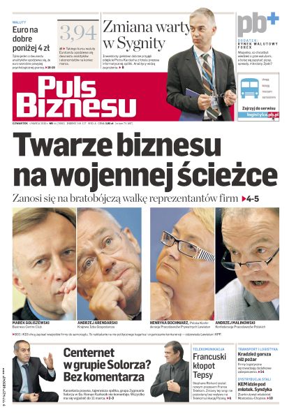 Zygmunt Solorz-Żak mówi, że nie chce już CenterNetu Romana Karkosika; BCC i KIG chcą zapisać wszystkie firmy do samorządu; Stéphane Richard przejął stery France Telecom; Piotr Kardach opuścił pokład Sygnity; bankructwo firmy Mariana Krawczyka nie zwiastuje problemów w branży stalowej — uspokajają eksperci; najlepsze firmy regionu dolnośląskiego też muszą walczyć o miejsce na rynku; operatorzy logistyczni wprowadzają dodatkowe zabezpieczenia, by chronić przewożone towary; wczorajszy wzrost kursu złotego to efekt wypowiedzi szefa NBP o konieczności podwyżek stóp procentowych; zagraniczne fundusze znowu budują portfele z akcji spółek z GPW.