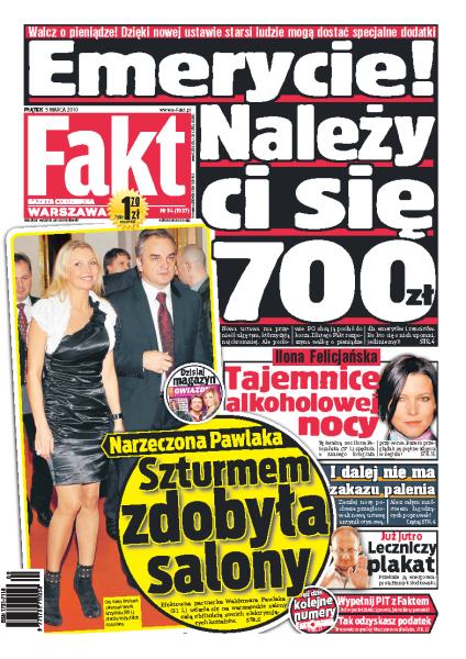 Wywiad z Adamem Bielanem na temat Jarosława Kaczyńskiego; już niedługo Sejm może przyjąć ustawę dzięki której emeryci mogą uzyskać dodatkowe 700 zł rocznie; partnerka Waldemara Pawlaka szturmem weszła na polityczne salony; jak poseł Kalisz odżywia się w czasie kryzysu; bandyta zaatakował starszego mężczyznę za marne 40 zł; dlaczego Ilona Felicjańska sięgnęła po kieliszek; Piotr Rubik kupił auto za 360 tys. zł; cała Polska wstydzi się za granatowe stroje reprezentacji podczas meczu z Bułgarią.