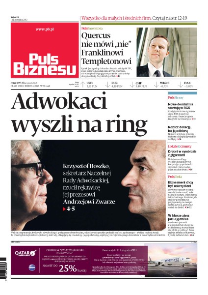 W piątek rozstrzygnie się, kto będzie szefem Naczelnej Rady Adwokackiej - na szali leżą wizerunek, odbudowa pozycji i pieniądze; lecznice nie mające kontraktu z NFZ poszukają pieniędzy w kieszeniach obcokrajowców - takie plany mają Cyberknife, Euromedic i Platinum Hospitals; prywatny samolot to w biznesie coraz częściej nie snobizm, lecz konieczność - w Polsce w trzy lata przybędzie ich co najmniej 100.
