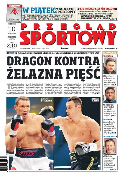 29 maja Albert Sosnowski będzie walczył z Witalijem Kliczką o pas mistrza świata federacji WBC; Maciej Skorża najprawdopodobniej straci posadę szkoleniowca Wisły Kraków; wywiad z Joelem Tshibambą, strzelcem zwycięskiej bramki dla Arki w meczu z Wisłą; analiza spotkań fazy pucharowej piłkarskiej Ligi Mistrzów; rozmowa z Adamem Małyszem po tym, jak po raz 81. stanął na podium zawodów Pucharu Świata.
