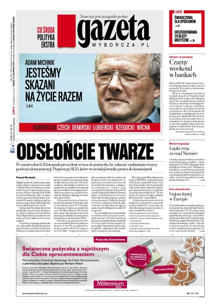 Po zamieszkach 11 listopada prezydent wraca do pomysłu, by zakazać zasłaniania twarzy podczas demonstracji, popiera go SLD, które wcześniej broniło prawa do kominiarek; klienci PKO BP i bankomatów Euro-net w długi weekend zostali odcięci od pieniędzy; łupki ceną za rząd Niemiec; Unia zdecydowała – gejom lepiej w Europie; odszkodowania za błędy medyczne.