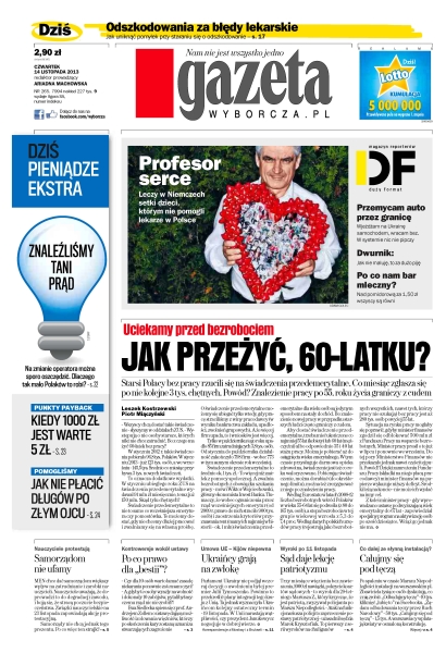 Starsi Polacy bez pracy rzucili się na świadczenia przedemerytalne, co miesiąc zgłasza się po nie kolejne 3 tys. Chętnych; MEN chce dać samorządom większy wpływ na zatrudnianie i zarobki nauczycieli; umowa UE – Kijów niepewna – Ukraińcy grają na zwłokę; odszkodowania za błędy lekarskie – jak uniknąć pomyłek przy staraniu się o odszkodowanie; profesor serce – leczy w Niemczech setki dzieci, którym nie pomogli lekarze w Polsce.
