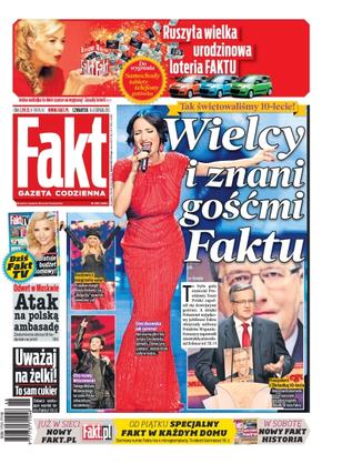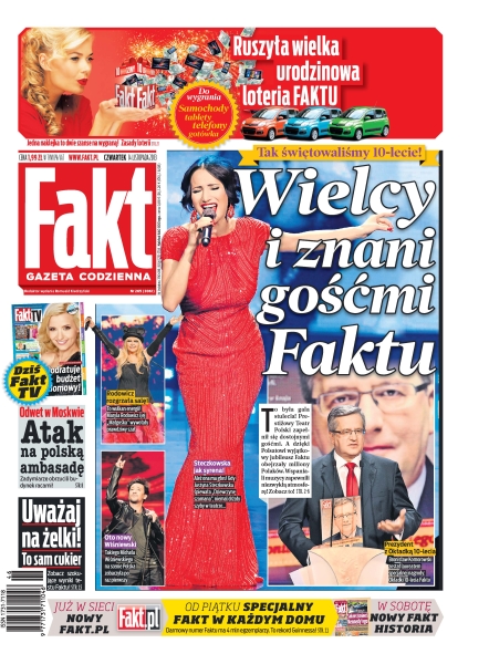 Na uroczystym 10-leciu naszej „Faktu” pojawiły się znakomitości ze świata polityki, sportu, itp; Rosjanie mszczą się za wybryki polskich chuliganów z 11 listopada; zobacz gdzie dostaniesz mandat nawet pieszo; Komorowski umiał wyciągnąć wnioski z błędów poprzedników; matka Madzi już nie płacze za swoim ukochanym Bartkiem.