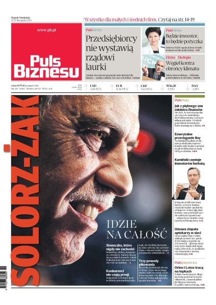 Ostatnie dwa lata nie przyniosły wiele ułatwień dla biznesu — wynika z ankiety Tax Care wśród firm; szefowa PARP zapala zielone światło konkursowi dla małych firm; Solorz-Żak idzie na całość; jak z pięknego snu ministra finansów; emerytalne przeciąganie liny; Kamiński częstuje inwestorów herbatą; ustawa złapała aptekarzy w sieci.