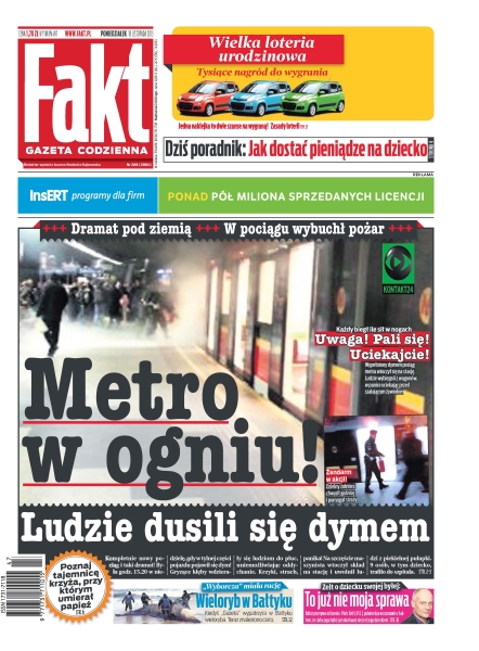Metro w ogniu, ludzie dusili się dymem – kompletnie nowy pociąg i taki dramat, w niedzielę w tylnej części pojazdu pojawił się dym, gryzące kłęby wdzierały się ludziom do płuc, uniemożliwiając oddychanie; wieloryb w Bałtyku – kiedyś „Gazeta Wyborcza” wypatrzyła w Bałtyku wieloryba, teraz znaleziono ciało; „To już nie moja sprawa” – Piotr Zelt o dziecku swojej byłej; poznaj tajemnicę krzyża, przy którym umierał papież; artyści wolą młodsze – nawet 26 lat różnicy, nasi celebryci wybierają sobie piękne, seksowne i bardzo młode partnerki; Robert Kubica mógł zabić człowieka – mrożące krew w żyłach chwile w Rajdzie Wielkiej Brytanii.