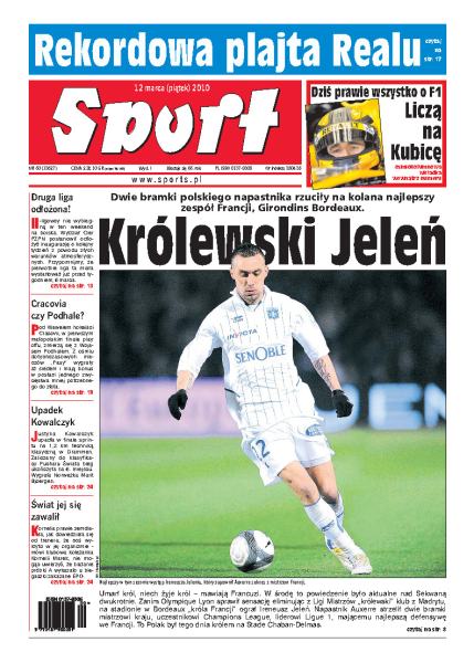 Kornelia Marek, która brała udział w igrzyskach olimpijskich w Vancouver, została przyłapana na stosowaniu dopingu; analiza przedmeczowa spotkań 20. kolejki piłkarskiej ekstraklasy; wywiad z Ireneuszem Jeleniem; Real Madryt wydał ostatnio olbrzymie kwoty na wzmocnienie zespołu, ale odpadł z Ligi Mistrzów już w 1/8 finału – to największa porażka menedżerska w historii piłki nożnej; wkładka poświęcona rozpoczynającemu się, nowemu sezonowi Formuły 1.