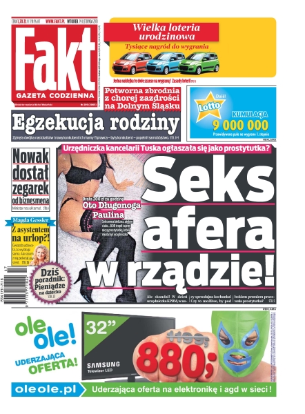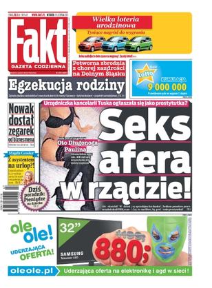 Seks afera w rządzie – urzędniczka kancelarii Tuska ogłaszała się jako prostytutka; egzekucja rodziny – zginęła dwójka nastolatków i nowy konkubent ich mamy, sprawca - były konkubent - popełnił samobójstwo; Nowak dostał zegarek od biznesmena – minister nas okłamał; Magda Gessler wyjechała z asystentem na urlop – gwiazda udawała, że wylatuje sama, ale razem z nią poleciał asystent; Rosati na bruku – Weronika nie ma ostatnio szczęścia, najpierw poważna kontuzja nogi, teraz kłopoty z pracą; Lewy bije rekordy, ale nie w strzelaniu – dziś zaledwie 25-letni piłkarz wstąpi do Klubu Wybitnego Reprezentanta.