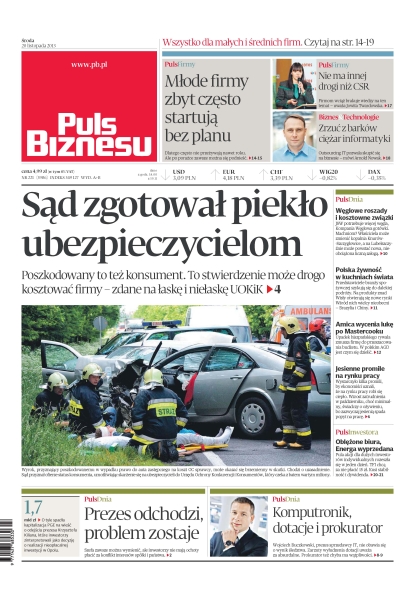 Sąd zgotował piekło ubezpieczycielom – poszkodowany to też konsument – to stwierdzenie może drogo kosztować firmy – zdane na łaskę i niełaskę UOKiK; młode firmy zbyt często startują bez planu – dlatego często nie przeżywają nawet roku, ale po porażce zawsze można się podnieść; zrzuć z barków ciężar informatyki – outsourcing IT pozwala skupić się na biznesie; prezes odchodzi, problem zostaje – szefa zawsze można wymienić, ale inwestorzy nie mają ochoty płacić za konflikt interesów spółki i państwa – o 1,7 miliarda złotych spadła kapitalizacja PGE na wieść o odejściu prezesa Krzysztofa Kiliana; Komputronik, dotacje i prokurator – Wojciech Buczkowski, prezes sprzedawcy IT, nie obawia się o wynik śledztwa – zarzuty wyłudzenia dotacji uważa za absurdalne, prokurator też chyba ma wątpliwości; Amica wycenia lukę po Mastercooku – upadek hiszpańskiego rywala zmusza firmę do przeszacowania budżetu – w polskim AGD jest czym się dzielić.