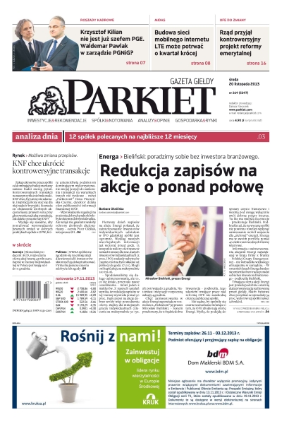 Redukcja zapisów na akcje o ponad połowę – „Poradzimy sobie bez inwestora branżowego.” – Mirosław Bieliński; Krzysztof Kilian nie jest już szefem PGE, czy Waldemar Pawlak zasiądzie w zarządzie PGNiG; KNF chce ukrócić kontrowersyjne transakcje – zakup aktywów przez spółki od dominujących akcjonariuszy zawsze budzi szereg pytań; Gorenje – słoweński producent AGD, rozpoczyna ofertę akcji wartą 43 mln euro, zapisy w transzy indywidualnej w Polsce potrwają od 6 do 11 grudnia; Polimex – NWZA spółki nie zgodziło się na emisje akcji dla wierzycieli i inwestorów skłonnych ją dokapitalizować; Midas – budowa sieci mobilnego internetu LTE może potrwać o kwartał krócej; OFE do zmiany – rząd przyjął kontrowersyjny projekt reformy emerytalnej.