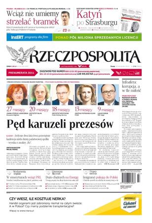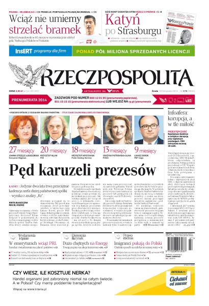 Pęd karuzeli prezesów – jedynie dwa lata trwa przeciętnie kadencja szefa dużej państwowej spółki; wciąż nie umiemy strzelać bramek – Robert Lewandowski w 60. meczu w reprezentacji nie zdobył gola, nudna gra Polaków w Poznaniu; infoafera: korupcja, a w tle miłość – największe śledztwo w związku z korupcją przy rządowych przetargach – CBA zatrzymało wczoraj 18 osób; dużo chętnych na Energę – trwają zapisy na akcje koncernu; imigranci pukają do Polski – chiński sposób na zdobycie naszej wizy; PO walczy z sobą, PiS się konsoliduje – najwyższe władze PO i PiS zbierają się w sobotę, w obu partiach nastroje są zupełnie inne; dyrektorzy znowu mają wzięcie – szybko przybywa ofert pracy dla menedżerów – to sygnał, że gospodarka wychodzi z kryzysu.