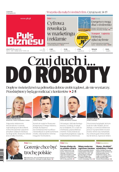 Czuj duch i do roboty – dopływ świeżej krwi na półmetku dobrze zrobi rządowi, ale nie wystarczy, przedsiębiorcy będą go rozliczać z konkretów; cyfrowa rewolucja w marketingu i reklamie – nowe narzędzia wyzwalają kreatywność; energetycy mogą dbać o środowisko – Energa w CSR stawia na trzy „e” — efektywność, ekonomię i ekologię; hybryda opłaci się firmie – w teście ekonomii porównaliśmy toyoty — hybrydową i diesla; Gorenje chce być trochę polskie – słoweńska firma, którą nad Wisłą kieruje Simon Kumer, poprosi inwestorów o pieniądze na spłatę długów; Europa dźwiga się na polskim asfalcie – firmy transportowe i logistyczne, niczym barometr, wskazują, w którą stronę waha się koniunktura – polski asfalt coraz częściej jeździ za granicę, to znak, że u sąsiadów też się poprawiło.
