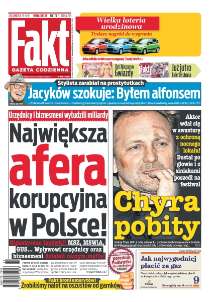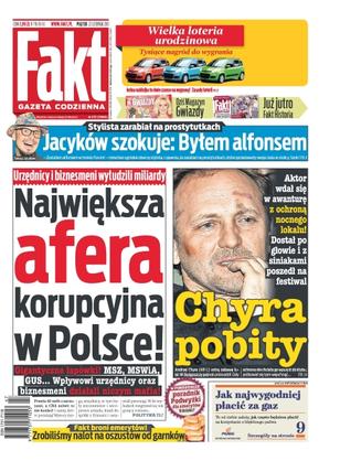 Największa afera korupcyjna w Polsce – gigantyczne łapówki, MSZ, MSWiA, GUS – wpływowi urzędnicy oraz biznesmeni działali niczym mafia; „Byłem alfonsem” – stylista, Tomasz Jacyków, znów szokuje; Fakt broni emerytów – zrobiliśmy nalot na oszustów od garnków; pół miliona za wymianę ministrów – odprawy, zaległe urlopy, służbowe limuzyny – odstawieni przez Donalda Tuska na bocznicę biurokraci wcale nie znikają, jeszcze przez kilka miesięcy będą doić podatnika; Wiedźmin, nasz światowy hit – kultowy bohater jest zbyt cenny, by mógł odejść na zawsze; czy Kościół zapłaci alimenty za księdza – to duchowny Waldemar Irek jest ojcem 3,5-letniego Kuby; pobili Chyrę na festiwalu – bramkarze nie chcieli wpuścić rozbawionego aktora do klubu, wdał się z nimi w szarpaninę, poobijany wrócił do hotelu.