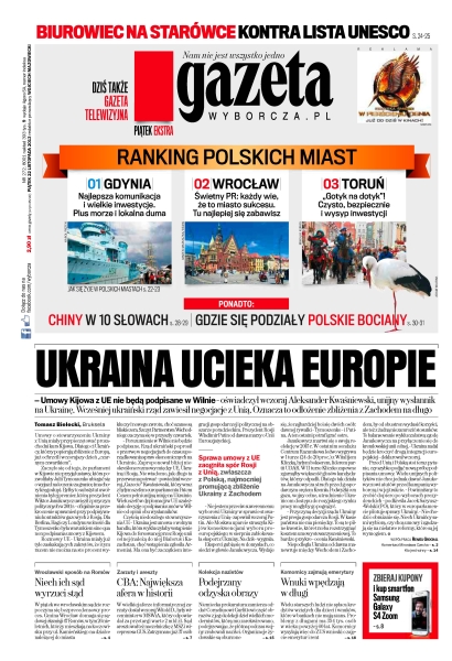 Ukraina ucieka Europie – „Umowy Kijowa z UE nie będą podpisane w Wilnie” – oświadczył wczoraj Aleksander Kwaśniewski, unijny wysłannik na Ukrainę – wcześniej ukraiński rząd zawiesił negocjacje z Unią, oznacza to odłożenie zbliżenia z Zachodem na długo; ranking polskich miast; niech ich sąd wyrzuci stąd – wrocławski sposób na Romów – w piątek we wrocławskim sądzie rozpoczyna się bezprecedensowy proces, gmina Wrocław domaga się sądowej eksmisji 47 Romów, w tym 26 nieletnich, którzy mieszkają na koczowisku przy ul. Kamieńskiego na działce należącej do miasta; podejrzany odzyska obrazy – niemiecka prokuratura zamierza oddać Corneliusowi Gurlittowi część obrazów z jego kolekcji dzieł wielkich modernistów, którą mu zarekwirowano, podejrzewając, że płótna podczas wojny zrabowali naziści; wnuki wpędzają w długi – wielu starszych ludzi nie spłaca kredytów wziętych dla dzieci i wnuków, które w bankach nie mają szans.