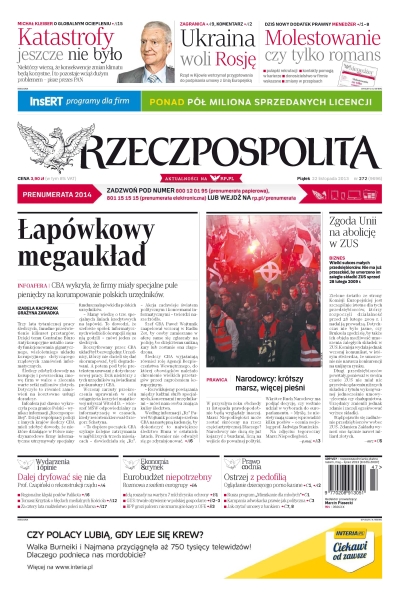 Łapówkowy megaukład – CBA wykryła, że firmy miały specjalne pule pieniędzy na korumpowanie polskich urzędników; katastrofy jeszcze nie było – „Niektórzy wierzą, że konsekwencje zmian klimatu będą korzystne. I to pozostaje wciąż dużym problemem” – Michał Kleiber, prezes PAN, o globalnym ociepleniu; Ukraina woli Rosję – rząd w Kijowie wstrzymał przygotowania do podpisania umowy z Unią Europejską; zgoda Unii na abolicję w ZUS – wielki sukces małych przedsiębiorców, nie ma już przeszkód, by umorzono im zaległe składki ZUS sprzed 28 lutego 2009 roku; „Krótszy marsz, więcej pieśni” – w przyszłym roku obchody 11 listopada prawdopodobnie będą wyglądały inaczej, Marsz Niepodległości może zostać skrócony na rzecz części artystycznej – narodowcy nie chcą się już kojarzyć z burdami, liczą na wejście do poważnej polityki.