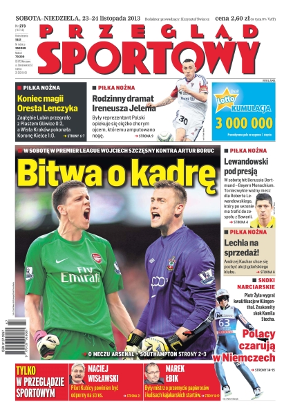 Bitwa o kadrę – w sobotę w Premier League Wojciech Szczęsny kontra Artur Boruc w meczu między Arsenalem i Southampton; rodzinny dramat Ireneusza Jelenia – były reprezentant Polski opiekuje się ciężko chorym ojcem, któremu amputowano nogę; koniec magii Oresta Lenczyka – Zagłębie Lubin przegrało z Piastem Gliwice 0-2, a Wisła Kraków pokonała Koronę Kielce 1-0; Lewandowski pod presją – w sobotę hit Borussia Dortmund – Bayern Monachium, to niezwykle ważny mecz dla Roberta Lewandowskiego, który po sezonie ma trafić do zespołu z Bawarii; Lechia na sprzedaż – Andrzej Kuchar chce się pozbyć akcji gdańskiego klubu; Polacy czarują w Niemczech – Piotr Żyła wygrał kwalifikacje w Klingenthal, znakomity skok Kamila Stocha; Marek Łbik – były mistrz o przemycie papierosów i kulisach kajakarskich startów.