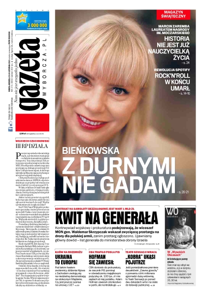 „Z durnymi nie gadam” – Elżbieta Bieńkowska; kwit na generała – kontrwywiad wojskowy i prokuratura podejrzewają, że wiceszef MON gen. Waldemar Skrzypczak wskazał zwycięzcę przetargu na drony dla polskiej armii, zanim przetarg ogłoszono; Ukraina to Europa – pod takim hasłem zwolennicy zbliżenia Kijowa z Zachodem zwołują się na niedzielną demonstrację na stołecznym Majdanie, czy jest jeszcze szansa na umowę z UE; Hofman się zawiesił – CBA doniosło do prokuratury, że rzecznik PiS pominął w oświadczeniu majątkowym pożyczkę ok. 100 tys. zł i nie zapłacił od niej podatku – Adam Hofman zawiesił członkostwo w partii, ale kontratakuje; „Kobra” ukąsi pojutrze – jeśli poniedziałkowa premiera dwuaktówki „Dawne grzechy” o porwaniu córki milionera zgromadzi dużą widownię, to Teatr Sensacji po ponad dwu dekadach wróci na stałe do telewizji publicznej.