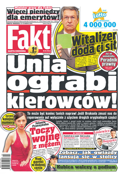 Biurokraci UE mogą zabronić właścicielom aut na gwarancji stosowania tańszych zamienników; minister Jolanta Fedak będzie walczyć o większe podwyżki dla emerytów; Jolanta Fraszyńska toczy wojnę z mężem; Robert Kubica na treningu przed wyścigiem w Bahrajnie; jak gwiazdy lansują sie w stolicy.