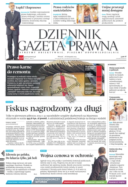 Szybkie wprowadzenie prawa łupkowego, wdrożenie prawa wodnego i korekta ustawy śmieciowej to priorytety nowego ministra środowiska Macieja Grabowskiego; można żądać mniejszych klas, a także dobierania do nich uczniów według zbliżonego wieku; nowe regulacje mogą zamknąć rynek zagranicznych zamówień publicznych dla polskich producentów; prawo karne do remontu; wysokie marże na stacjach paliwowych oraz wejście w życie znowelizowanej ustawy o VAT spowodowały, że szara strefa w handlu paliwami zaczęła się kurczyć; była premier Ukrainy Julia Tymoszenko rozpoczęła strajk głodowy; tylko w pierwszym półroczu 2013 r. 51 naczelników urzędów skarbowych na Mazowszu otrzymało w sumie 497,6 tys. zł premii, a administracji podatkowej brakuje na bieżące wydatki; niewielkie samorządy wolą takimi pozostać i z tego tytułu otrzymywać pokaźne wsparcie oświatowe.