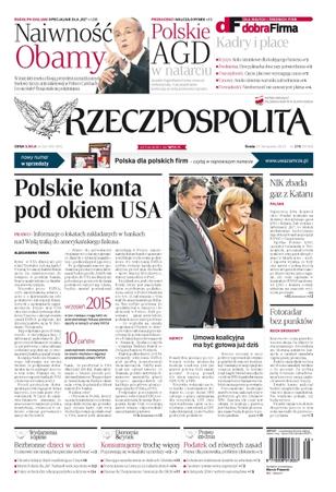 Informacje o lokatach zakładanych w bankach nad Wisłą trafią do amerykańskiego fiskusa; szkoła nie uczy bezpiecznego korzystania z sieci, choć ryzykowne zachowania online są wśród uczniów powszechne; premier wciąż nie przyjął sprawozdania prokuratora generalnego; nie ma chętnych, żeby pokryć rachunki za zniszczenia podczas Marszu Niepodległości; IPN chce przypomnieć, jak zróżnicowana była opozycja w PRL; powodem zerwania przez Ukrainę rozmów z Brukselą był brak oferty finansowej, która uratowałaby kraj przed bankructwem; ruiny i zabytki starożytnego królestwa i miasta badają na Ukrainie polscy naukowcy; sędziowie w ekstraklasie są jednymi z najmłodszych w Europie; producenci sprzętu – głównie Amica, Indesit i Beko – chcą zagarnąć jak największą część sprzedaży generowanej dotąd przez upadły FagorMastercook.