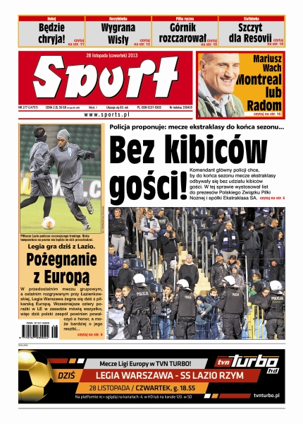 Komendant główny policji chce, by do końca sezonu mecze ekstraklasy odbywały się bez udziału kibiców gości; jeżeli ktoś spisywał BVB na straty, to we wtorek zobaczył zespół, który mając „swój dzień” może pokonać każdego; hat trick strzelony Koronie Kielce miał być mocną kartą przetargową Łukasza Janoszki w rozmowach o przedłużeniu kontraktu; do sukcesu z Euroleasing Sopron Wisłę poprowadziły Jantel Lavender i Zane Tamane, które zdobyły ponad połowę punktów dla swojej drużyny; uderzenie Radwańskiej z turnieju w Miami, zagraniem roku w plebiscycie WTA; mam wielu kibiców i przeciwników – tych pierwszych chciałbym ucieszyć, a tym drugim pokazać, że się nie wypaliłem – mówi Mariusz Wach.