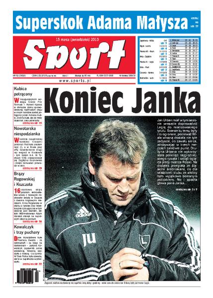 Adam Małysz po raz kolejny z rzędu stanął na podium zawodów Pucharu Świata i tym samym zajął piąte miejsce w klasyfikacji generalnej; czy podczas piątkowego spotkania Maciej Skorża poprowadził drużynę Wisły Kraków po raz ostatni; Jan Urban przestał być szkoleniowcem Legii Warszawa; szczegółowa analiza spotkać 20. kolejki piłkarskiej ekstraklasy; Arjen Robben zapewnił Bayernowi sporo pieniędzy i pozwolił utrzymać fotel lidera Bundesligi; Robert Kubica miał olbrzymiego pecha podczas wyścigu inaugurującego nowy sezon Formuły 1.