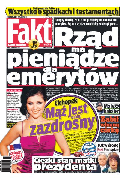 Politycy kłamią, że nie ma pieniędzy na dodatki dla emerytów – są, ale władza musiałaby zacisnąć pasa; stan Jadwigi Kaczyńskiej jest coraz cięższy, jej synowie czuwają przy niej cały czas; w jakich warunkach książę Karol i jego żona Camilla będą spać w Belwederze; co czeka osoby, które nie regulują swoich opłat w terminie; namiot cyrkowy zawalił się podczas przedstawienia i zabił trzy osoby; wszystko o spadkach i testamentach.