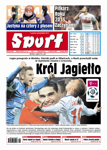 Legia przegrała w Bielsku, Górnik padł w Gliwicach, a Ruch przechylił szalę w wymianie ciosów z Cracovią; Robert Lewandowski dwie „jedenastki” zamienił na gole. Drugą – w kontrowersyjnych okolicznościach; pod nieobecność Cristiano Ronaldo klasę pokazał Gareth Bale, zdobywając trzy gole i zaliczając asystę w meczu z Realem Valladolid; w Indianapolis zakończyła się zwycięska seria Washington Wizards; 16 grudnia, podczas oficjalnej gali w centrum technicznym w Wersalu pod Paryżem, Citroen Racing Team przedstawi zawodników, którzy będą fabrycznymi kierowcami w 2014 roku; Justyna Kowalczyk uplasowała się tuż za podium cyklu Ruka Triple – w Kuusamo najlepsza okazała się Marit Bjoergen; najlepszy polski tenisista zakończył w Łodzi testy rakiety – w najbliższym sezonie będzie grał Babolatem Pure Control.