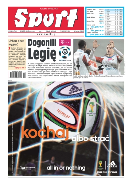 Dogonili Legię – w Zabrzu mogą dziś radośnie świętować Barbórkę, bo ich Górnik po trudnym meczu pokonał Widzew; obowiązek „Kanonierów” – Arsenalowi nie wolno stracić punktów w starciu przeciwko Hull, Arsene Wenger rozmyśla nad tym jak wzmocnić zespół zimą; ani kroku w tył – CCC Polkowice jest pod ścianą, jeśli pokona ZVVZ USK Praga wróci do gry o awans do kolejnej rundy, porażka szanse ograniczy do minimum; próba ogniowa – słowacki nastolatek dostał szansę występu w bramce gospodarzy i wszystkich pozytywnie zaskoczył; trzecie starcie – w nocy z piątku na sobotę w Chicago po raz kolejny zmierzą się Krzysztof „Diablo” Włodarczyk i Włoch Giacobbe Fragomeni; czy Wenta zapłaci głową – w Vive nabrali wody w usta, ale wszystko wskazuje na to, że dni Bogdana Wenty w Kielcach są policzone.