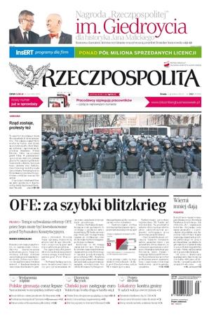 OFE, za szybki blitzkrieg – tempo uchwalania reformy OFE przez Sejm może być kwestionowane przed Trybunałem Konstytucyjnym; rząd zostaje, protesty też – to miał być decydujący dzień dla ukraińskich demonstrantów, w parlamencie opozycji nie starczyło jednak głosów, by zmusić rząd Mykoły Azarowa do odejścia; polskie gimnazja coraz lepsze – nasi uczniowie w europejskiej czołówce; chiński juan zastępuje euro – waluta Kraju Środka drugą w handlu; lokatorzy kontra gminy – w sądach walczą o zwrot czynszu; wierni mniej dają – Kościół może wpaść w tarapaty finansowe po likwidacji Funduszu Kościelnego – jak obliczyła „Rz”, organizacje kościelne otrzymują coraz mniej pieniędzy z 1 procenta odpisu od podatku oraz darowizn; Moskwa ma jeszcze ukryte atuty – w Kijowie ważą się losy najważniejszego projektu Władimira Putina, jakim jest Unia Eurazjatycka.
