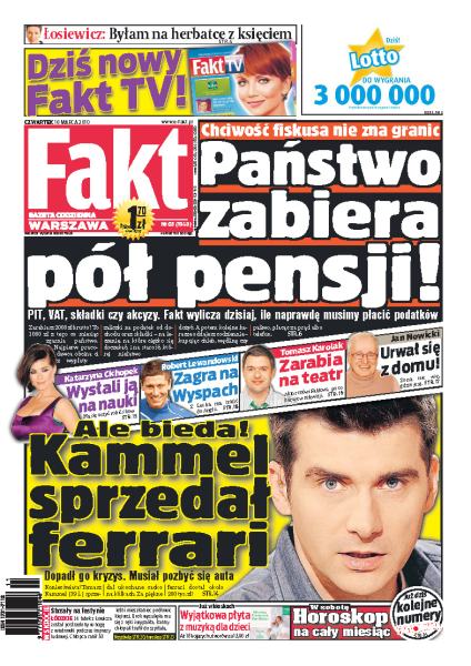 Czy istnieje realna szansa na to, by nowa siła polityczna odebrała władzę z rąk PO i PiS; śmietanka towarzyska Warszawy i następca tronu brytyjskiego książę Karol przybyli na koncert do auli Uniwersytetu Muzycznego; jaka część naszej pensji zostaje przeznaczona na opłacenie podatków; „Fakt” dotarł do założeń ustawy, dzięki której babcie opiekujące się wnukami dostaną pieniądze; nieznane kulisy kradzieży pięciu milionów złotych; Tomasz Kammel sprzedał swoje ferrari – sportowe auto było dla prezentera zbyt drogie w utrzymaniu.