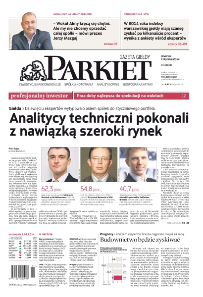 Analitycy techniczni pokonali z nawiązką szeroki rynek – dziewięciu ekspertów wytypowało osiem spółek do styczniowego portfela; profesjonalny inwestor – pora doby najlepsza do spekulacji na walutach; Alma liczy na udany 2014 rok – „Wokół Almy kręcą się chętni. Ale my nie chcemy sprzedać całej spółki” – mówi prezes Jerzy Mazgaj; prognozy dla GPW – w 2014 roku indeksy warszawskiej giełdy mają szansę zyskać po kilkanaście procent – wynika z ankiety wśród ekspertów; budownictwo będzie zyskiwać – zdaniem ekspertów branża najgorsze ma już za sobą; Borsa Istambul – Nasdaq OMX Group oraz giełda w Stambule poinformowały o podpisaniu porozumienia, na mocy którego Nasdaq OMX ma objąć 5 proc. udziałów w rynku tureckim; DM IDMSA – broker sprzedał 92,3 proc. akcji Electusa spółkom Devoran oraz United za 103,2 mln zł; Prognozy – ekonomiści z 23 instytucji finansowych ankietowanych przez „Parkiet” przewidują, że wartość produkcji sprzedanej przemysłu była w grudniu o ponad 10 proc. wyższa niż przed rokiem – spodziewają się też solidnego ożywienia produkcji budowlanej.
