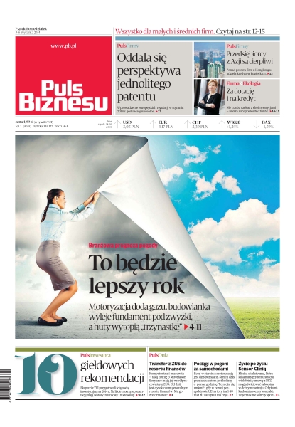 To będzie lepszy rok – motoryzacja doda gazu, budowlanka wyleje fundament pod zwyżki, a huty wytopią „trzynastkę”; oddala się perspektywa jednolitego patentu – wprowadzenie europejskich regulacji w styczniu 2014 r. jest raczej nierealne; przedsiębiorcy z Azji są cierpliwi – ponad połowa firm z Hongkongu udziela kredytów kupieckich; 10 giełdowych rekomendacji – eksperci z TFI przygotowali ściągawkę inwestycyjną na 2014 r – na liście mocną reprezentację mają sektory: finansowy i budowlany; transfer z ZUS do resortu finansów – kompetentna i pracowita — taką opinię o Mirosławie Boryczce mają jej współpracownicy z ZUS – od dziś jest dyrektorem generalnym resortu finansów, ma go zreformować; życie po życiu Sensor Cliniq – klinika okulistyczna, która kilka miesięcy temu straciła wieloletnią umowę z NFZ, mogła świętować sylwestra w dobrym nastroju, od płatnika dostała roczny kontrakt.