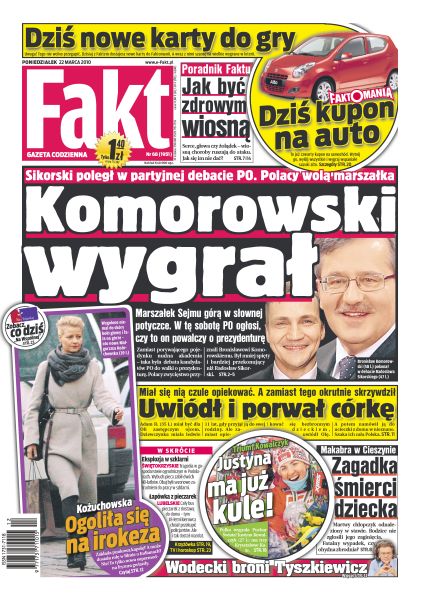 Marszałek Sejmu górą w słownej potyczce - w sobotę PO ogłosi, czy to on powalczy o prezydenturę; zioła poprawią twój nastrój i uspokoją skołatane nerwy; Małgorzata Kożuchowska przywitała wiosnę piękną i bardzo odważną fryzurą; wiosna nasila dolegliwości organizmu, ale też ujawnia, że dzieje się w nim coś złego; Justyna Kowalczyk była bezkonkurencyjna w tym sezonie - zgarnęła wszystkie Kryształowe Kule; w Krakowie Biała Gwiazda zagrała wreszcie jak mistrz Polski; Legia Warszawa z nowym trenerem nie potrafi pokonać rywala; Ireneusz Jeleń w meczu z Le Mans zdobył dziesiątą bramkę w tym sezonie.