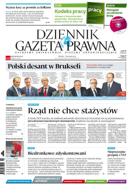 Polski desant w Brukseli; rząd nie chce stażystów; pod markami sieci dyskontowych powstanie w tym roku co najmniej 430 placówek; nieprecyzyjne przepisy o VAT; przedsiębiorcy z branży recyklingowej jako absurd oceniają normę dotyczącą odpadów opakowaniowych; ciepły grudzień pomógł naszemu PKB; Warszawa znowu wyprzedzi Oslo – polski PKB będzie większy niż norweski; analitycy twierdzą, że złoto nie musi już tanieć.