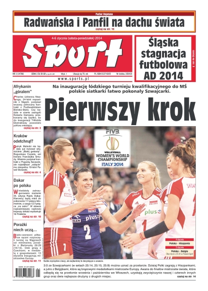 Pierwszy krok – na inaugurację łódzkiego turnieju kwalifikacyjnego do MŚ polskie siatkarki łatwo pokonały Szwajcarki; Afrykanin „górale” – Charles Uchenna Nwaogu, 24-letni napastnik z Nigerii, podpisał wczoraj półroczny kontrakt z Podbeskidziem Bielsko-Biała; czy Kraków odetchnął – Patry Małecki nie będzie już irytował właściciela „Białej gwiazdy”, Bogusława Cupiała, ani trenera Franciszka Smudy – właśnie podpisał kontrakt z Pogonią Szczecin, ale największe „wzięcie” ma niespełna 18-letni Paweł Stolarski; Dakar po polsku – w niedzielę zainaugurowana zostanie 35. edycja Rajdu Dakar; porażki niech uczą... – biało-czerwoni piłkarze ręczni rozpoczęli turniej na Węgrzech od minimalnej porażki z Białorusią 28-29 – dziś grają z Czechami, w niedzielę z gospodarzami.