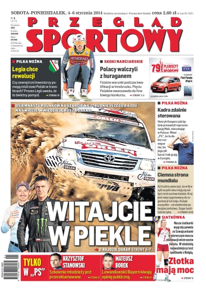 Witajcie w piekle – osiemnastu Polaków na starcie najtrudniejszego rajdu na świecie, w niedzielę rusza Dakar; Legia chce rewolucji – czy zewnętrzni inwestorzy pomogą mistrzowi Polski w transferach, prezes Legii uważa, że to świetny pomysł; Polacy walczyli z huraganem – fatalne warunki podczas kwalifikacji w Innsbrucku – pięciu Polaków awansowało do finałowego konkursu; kadra zdalnie sterowana – Henryk Kasperczak będzie prowadził reprezentację Mali, mieszkając w Polsce – mówi „PS”, że to dobre rozwiązanie, bo jego piłkarze i tak grają w Europie; ciemna strona mundialu – aż trudno uwierzyć, że w Brazylii za pół roku mają się odbyć mistrzostwa świata – kraj jest nieprzygotowany do organizacji turnieju, kuleje wszystko – od stadionów po bezpieczeństwo – zegar bezlitośnie tyka; złotka mają moc – nasze siatkarki wygrały pewnie ze Szwajcarkami w pierwszym meczu eliminacji mistrzostw świata – w niedzielę najważniejszy test – spotkanie z Belgią.