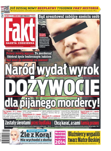 Naród wydał wyrok, dożywocie dla pijanego mordercy – Polacy mówią wprost: to morderca, odebrał życie bezbronnym ludziom, sąd musi go zamknąć na zawsze; źle z Korą, nie wychodzi z domu – mąż donosi chorej Korze posiłki z restauracji; bluźniercy wypalili twarz Matce Boskiej – świętokradcy zniszczyli święty obraz w sanktuarium; chcą karać, a sami łamią prawo – politycy to hipokryci, zanim wezmą się za karanie piratów, powinni rozliczyć siebie; zostały sierotami przez bydlaka – pijany i naćpany zabił rodziców Julci i Huberta, maleństwa zostały same; egzorcyzmy zabiły opętaną – zwyczajna, pobożna dziewczyna, do czasu, gdy wstąpiły w nią demony: Hitler, Neron, Judasz, Kain, potępiony ksiądz Fleischmann i Lucyfer.