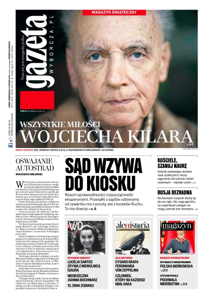 Sąd wzywa do kiosku – resort sprawiedliwości rozpoczął wielki eksperyment – przesyłki z sądów odbieramy od czwartku nie z poczty, ale z kiosków Ruchu, to nie dowcip; Kościele, szanuj naukę – Kościół, podważając dorobek nauk społecznych, tworzy zagrożenie dla wolności badań naukowych – napisali uczeni; Rosja bezradna – na Kaukazie rosyjskie służby są jak we mgle – nie mają agentów, na urzędnikach polegać nie mogą, ludność jest niechętna; wszystkie miłości Wojciecha Kilara; feministka niechętnie – kobieta, która przyznaje się do feminizmu i studiów gender, ma mniejsze szanse na pracę i awans; wojna dwóch kobiet o Bangladesz – 23-letnia rywalizacja między paniami stojącymi naprzemiennie na czele rządu weszła w niebezpieczny etap – jedna z nich właśnie wypisuje Bangladesz z klubu państw demokratycznych, druga pogrąża go w chaosie.