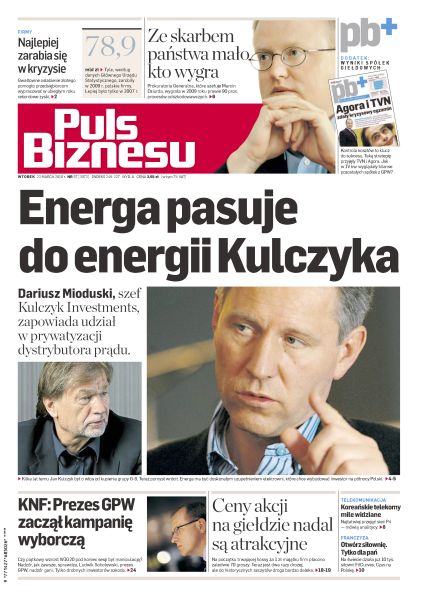 Dariusz Mioduski, szef Kulczyk Investments, zapowiada udział w prywatyzacji dystrybutora prądu; państwo nokautuje Polaków w sądach; analitycy wątpią, czy inwestor branżowy mógłby wejść do Polkomtela; jakie są prognozy dla rynku hotelowego w Polsce; polskie miejscowości turystyczne potrzebują wielu inwestycji, aby dorównać europejskim standardom; sprzedaż mieszkania w Warszawie trwa średnio 100 dni; na giełdzie nie ma już promocji, ale do przewartościowania rynku droga jeszcze bardzo daleka; inwestor z Londynu, który stoi za piątkowym zamieszaniem, skłócił Komisję Nadzoru Finansowego z GPW; Agora i TVN zdały kryzysowy egzamin.
