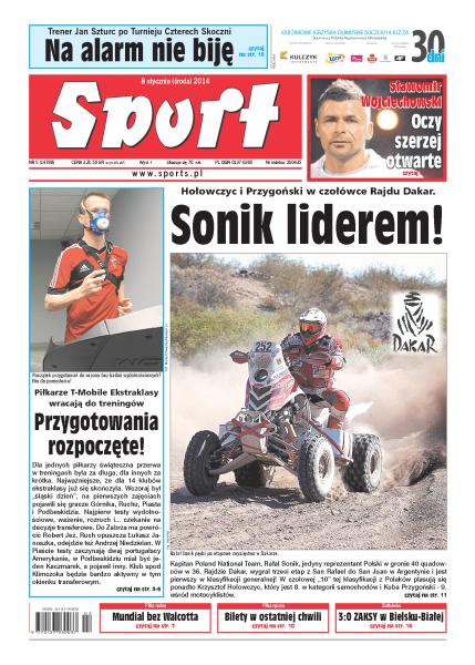 Sonik liderem Dakaru wśród quadowców; piłkarze T-Mobile Ekstraklasy wracają do treningów; trener Jan Szturc po Turnieju Czterech Skoczni; Sławomir Wojciechowski, jedyny Polak, który grał dla Bayernu Monachium: oczy szerzej otwarte; mundial bez Theo Walcotta; 3:0 ZAKSY w Bielsku-Białej.