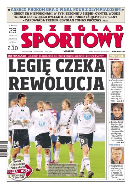 Legię czeka rewolucja – z klubem z Łazienkowskiej może się pożegnać nawet połowa drużyny; kim jest nowy trener Legii Warszawa – sam o sobie mówi, że jest z gatunku skazanych na wymarcie; Tomasz Mikołajczak w niedzielę znów wyjdzie w podstawowym składzie Lecha Poznań; wywiad z Gerrym Peytonem, trenerem bramkarzy Arsenalu; z obawy przed chuliganami z Paryża Jeleń i Dudka zagrają przy pustych trybunach; dziś pierwszy mecz o Final Four Euroligi; subiektywne i nie do końca poważne podsumowanie sezonu PlusLigi; trener Bogdan Wenta powołał 15 zawodników na turniej Pannon Cup na Węgrzech.