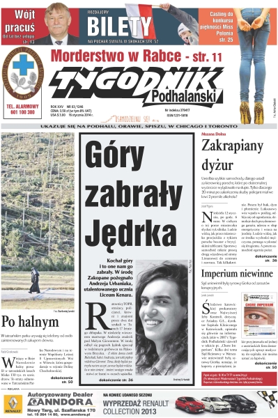 Góry zabrały Jędrka – w środę Zakopane pożegnało Andrzeja Urbaniaka, utalentowanego ucznia Liceum Kenara; w tatrzańskim parku urywają się telefony od osób zainteresowanych zakupem drewna; sąd uniewinnił byłą synową Gierka od zarzutów korupcyjnych; zakrapiany dyżur – dlaczego 20 minut po zakończeniu służby policjant miał we krwi 2 promile alkoholu; morderstwo w Rabce.