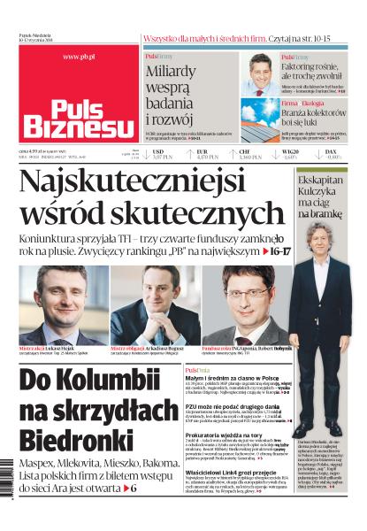 Koniunktura sprzyjała TFI – trzy czwarte funduszy zamknęło rok na plusie – poznaj zwycięzców rankingu „PB”; naszą żywność w Kolumbii będzie serwował właściciel Biedronki; miliardy wesprą badania i rozwój – NCBR zorganizuje w tym roku kilkanaście naborów w programach wsparcia; faktoring rośnie, ale trochę zwolnił; branża kolektorów boi się luki – jeśli program dopłat wejdzie za późno, firmy mogą nie przetrwać; Dariusz Mioduski, do niedawna jeden z najlepiej opłacanych menedżerów w Polsce, kierujący międzynarodowym biznesem Kulczyka, kupił warszawską Legię; małym i średnim za ciasno w Polsce – aż 39 proc. polskich MSP planuje zagraniczną ekspansję; PZU może nie wypłacić drugiej raty dywidendy; Prokuratoria Generalna zajmie się problemem odszkodowań z tytułu zawyżonych opłat za kolejową infrastrukturę; właścicielowi Link4 grozi przejęcie.