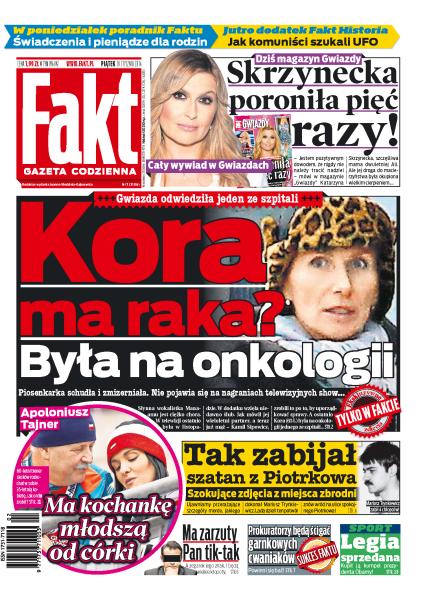 Czy Kora ma raka; jak zabijał szatan z Piotrkowa; Apoloniusz Tajner ma kochankę młodszą od córki; Sławomir Nowak ma zarzuty prokuratorskie; prokuratorzy będą ścigać garnkowych cwaniaków; ITI sprzedało Legię; poseł cham groził ludziom bronią; łapówki są legalne, zobacz, jak je brać; Agata Młynarska bierze ślub; dramat Krzysztofa Krawczyka: na scenie zapomina tekstu; Skrzynecka wyznaje w wywiadzie, że poroniła pięć razy.