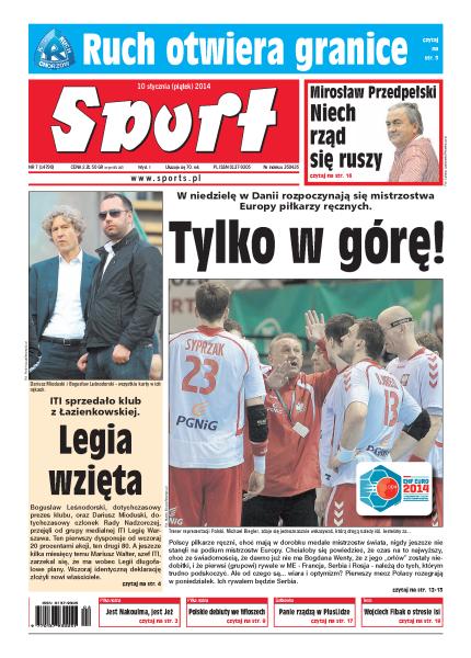 W niedzielę w Danii rozpoczynają się mistrzostwa Europy piłkarzy ręcznych – czy nasza reprezentacja stanie na podium; ITI sprzedało Legię; Ruch otwiera się na zagranicznych piłkarzy; polskie debiuty we Włoszech; panie rządzą w PlusLidze; Wojciech Fibak o stresie Agnieszki Radwańskiej; opowieść o Marianie Szei, który zatrzymał Anglików wcześniej niż Tomaszewski; fani wyżej oceniają umiejętności Roberta Lewandowskiego niż Mario Mandzukicia; śląskie naj... 2013; rozmowa z Mirosławem Przedpełskim o organizacji mistrzostw świata w siatkówce; ATP, czyli Alfabet Tenisa Polskiego 2013; w Dakarze znowu głośno o Polakach.