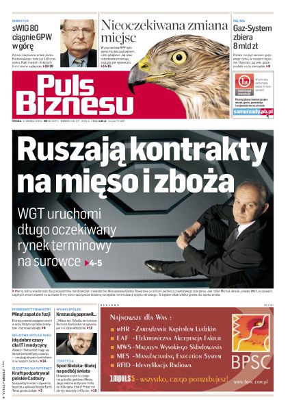 WGT uruchomi długo oczekiwany rynek terminowy na surowce; zdjęcia satelitarne nie pomogły wypatrzyć nowych instalacji w fabryce przejmowanego rywala w Skarbimierzu; pośrednicy finansowi poczuli powiew wiosny i odwiesili fuzje na kołku; Gaz-System ma ambitne plany udziału w rozbudowie międzynarodowych połączeń; seksowny biznes z małego miasta podbija Europę; siedmiu z dziesięciu członków RPP zmieniło podejście do podwyżek stóp; dublowanie serwerów można zastąpić oprogramowaniem; najwyższe uznanie ekspertów rynku kapitałowego uzyskały też PGE, Ipopema Securities, Cinema City i PEP.