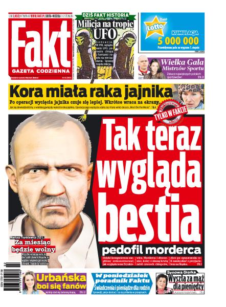 Tak wygląda teraz bestia pedofil morderca; Kora miała raka jajnika; Wielka Gala Mistrzów Sportu; Urbańska boi się fanów; synowa Gierka wyszła za mąż dla pieniędzy; reporter „Faktu” z alkomatem w Sejmie; afera Amber Gold: jak to możliwe, że urzędnicy przymykali oko na przekręty karanego już za oszustwa Marcina P.; agencie Tomku, nie pajacuj; rosyjski najazd na Biedronkę i Lidla; ruszył głośny proces prezesa wydawnictwa Magnum-X; Legia ma miliony, a w Europie gra słabo; Anna Lewandowska stroi się dla Roberta; koszmarny wypadek skoczka Thomasa Morgensterna.