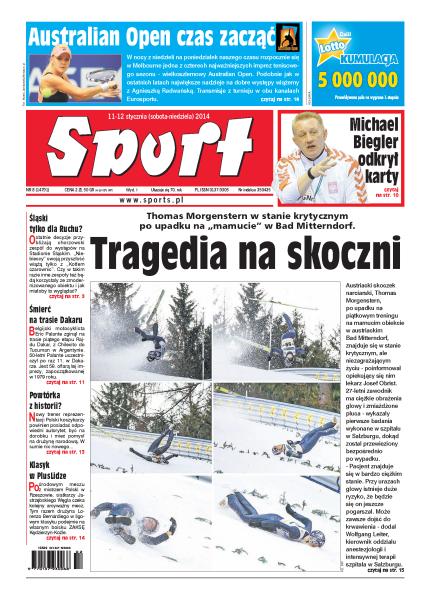 Thomas Morgenstern w ciężkim stanie po upadku na „mamucie” w Bad Mitterndorf; Australian Open czas zacząć; Michael Biegler, trener naszych piłkarzy ręcznych, odkrył karty; czy Stadion Śląski będzie tylko dla Ruchu; belgijski motocyklista Eric Palante zginął na trasie Dakaru; nowy trener reprezentacji Polski koszykarzy powinien posiadać odpowiedni autorytet, być na dorobku i mieć pomysł na drużynę narodową; klasyk w PlusLidze: Jastrzębski Węgiel podejmie na własnym boisku ZAKSĘ Kędzierzyn-Koźle.